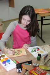 Ребята подробно изучают различные виды славянских и латинских шрифтов (устав, полуустав, скоропись, вязь, текстура, фрактура, ротунда, гуманистический минускул и т.д.), правила написания шрифтов, инструменты для письма, художественные материалы, элементы внешнего и внутреннего убранства книги (заставка, концовка, колофон, лигатура, инициал и т.д.), художественные техники (монотипия, тонировка бумаги различными художественными материалами, создание авторских принтов и т.д.), техники «состаривания» рукописной книги.